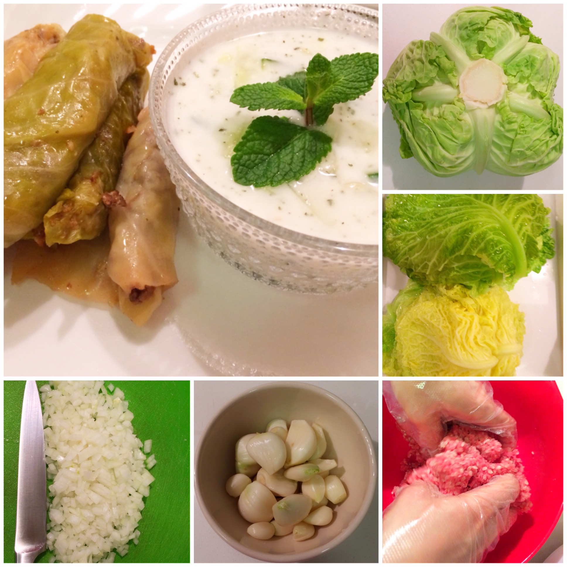 Blanch the cabbage leaves in boiling water until they are tender. Cut the leaves in half if necessary and take the thick stems out (save them to line pot). Mix the meat with rice and spices and put aside. Stir-fry onion, garlic and mint in vegetable oil in the bottom of the pot then line the pot with the cabbage stems. Stuff the leaves by placing a tablespoon of the filling mixture in the middle and rolling it like a cigar. Place each stuffed leaf in the pot, one tight layer at a time. Add some garlic cloves here and there. Place a small plate on the cabbage rolls to hold them in place and to avoid the stuffing from coming out. Pour the lemon juice over the rolls and add water to cover the cabbage. Cook for about 1 hour over low heat or until the leaves are very tender and the stuffing is well cooked. Serve warm with plain Greek yogurt or with a minty cucumber yogurt accompaniment. Yum, trop chou!