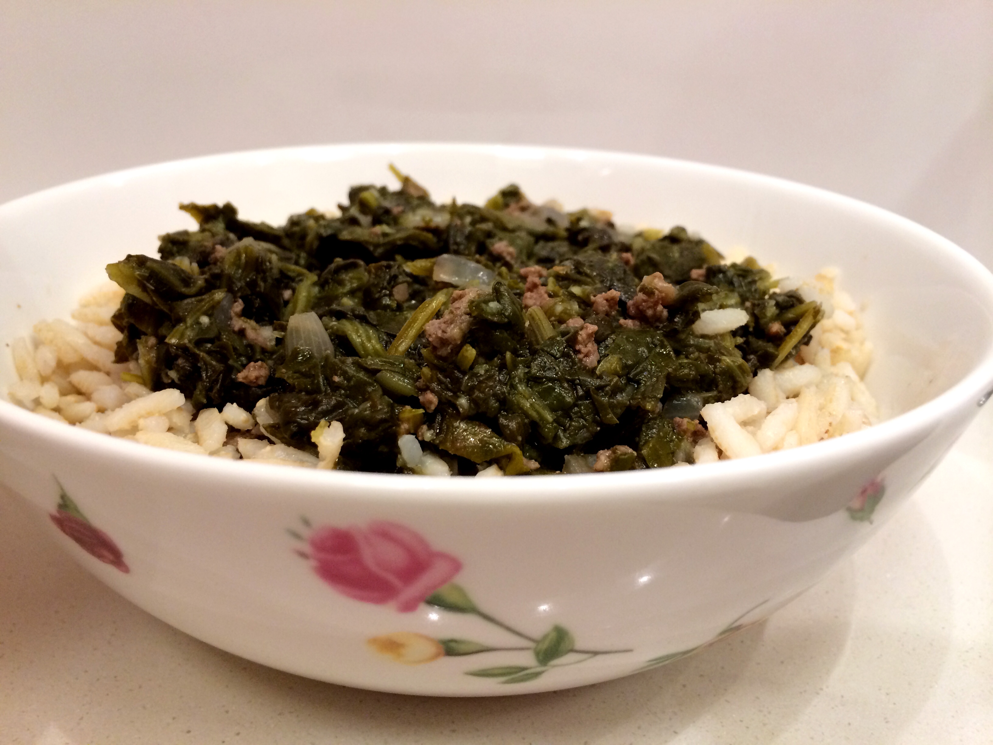 Blend the garlic and cilantro into a paste and stir-fry it in vegetable oil on the side. Stir-fry the onion in main pot with the rest of the vegetable oil. Add the meat and cook it while breaking it into very small pieces. Add the spices and salt. Cover the meat with the spinach and add water. Let it cook for 15-20 minutes. Add the lemon juice, cilantro-garlic paste, and stir all the ingredients together. Cover the pot again and cook for 5 more minutes. Serve warm with whole grain rice.