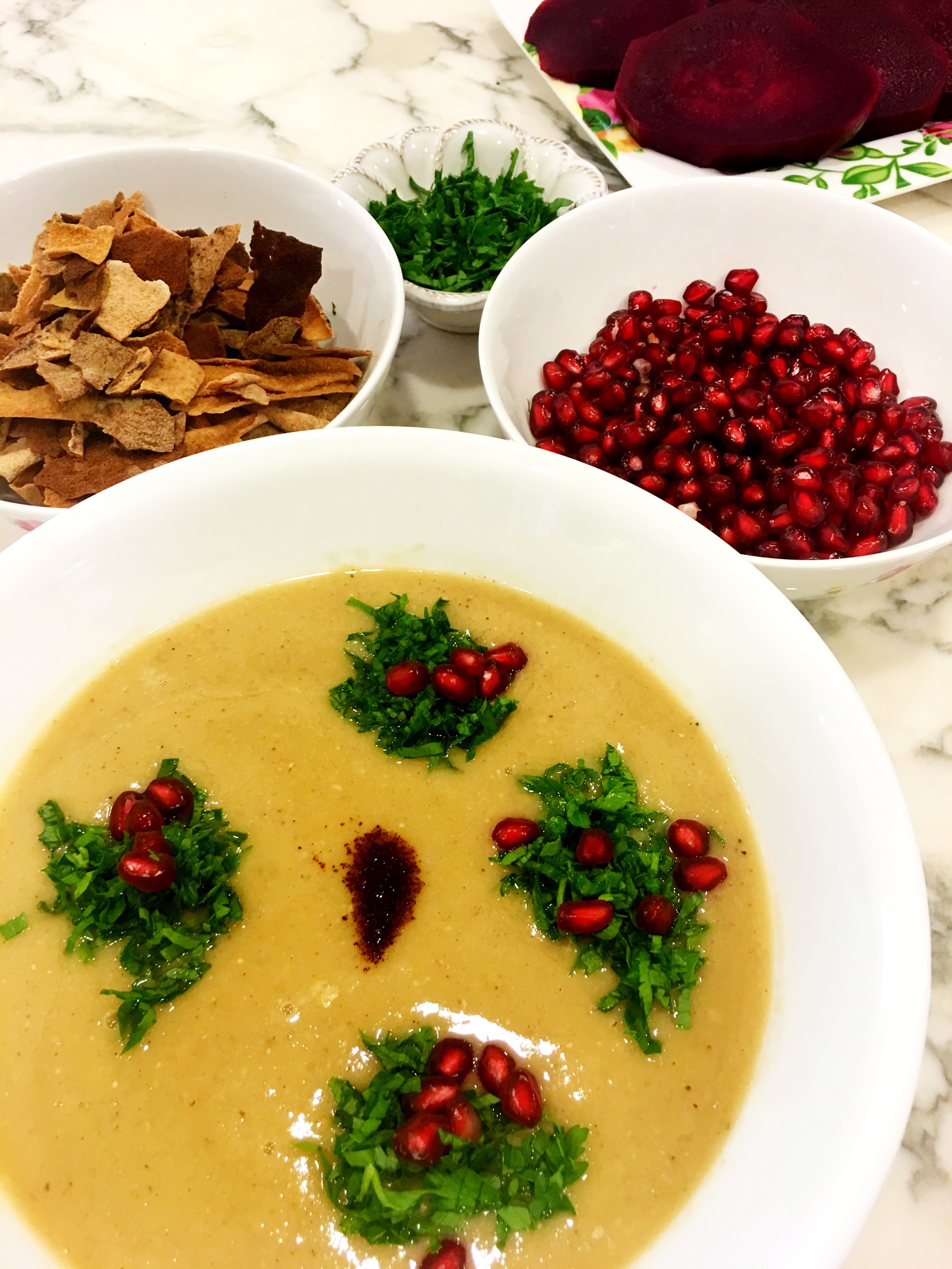 Add oil, onion and spices to a pot and stir fry. Add lentils, cover generously with water and let it simmer for at least 30 minutes. Add lemon juice on low heat for 5 minutes. Blend then serve preferably warm and garnished with pomegranate, chopped parsley and grilled pitta bread 🍲