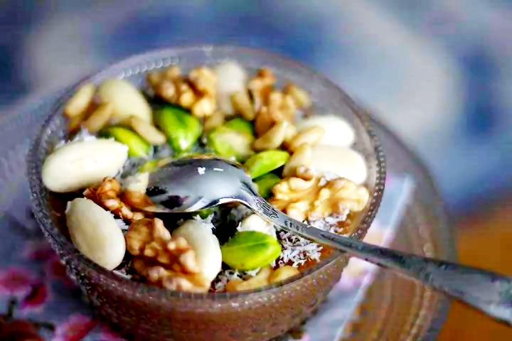 - Toppings: shredded coconut, raw walnuts, pine nuts, almonds and pistachios, each boosting your diet with filling protein, fiber, healthy unsaturated fats and important vitamins, minerals and antioxidants.