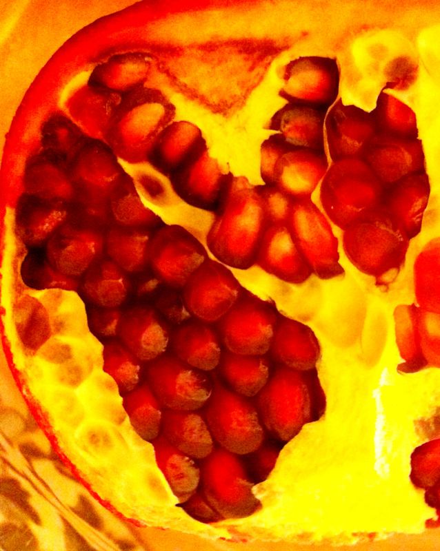 As I shopped this morning through the produce section of my neighborhood’s market I saw these fresh bursting red pomegranates and my taste buds started a dance! I can’t wait to introduce my little girl to this juicy mosaic so we can become pom-buddies! Pomegranates rush you burst-by-burst into a heavenly state of mind. In fact, the pomegranate is an ancient fruit mentioned in almost every religion symbolizing various positive concepts and has also historically appeared in art and medicine for centuries. Today there’s a renewed focus on researching and studying the health benefits of this fruit and the juice made from its seeds and white membrane (an even higher source of antioxidants), especially in the western world where it’s still an exotic and relatively unknown fruit in opposition to the Middle East and some Mediterranean regions where it’s taken for granted for cultivation reasons. By virtue of its antioxidant richness, the pomegranate is considered very healthy for the heart and an anticancer food. It’s also a good source of Dietary Fiber and Folate and a very good source of Vitamin C and Vitamin K. In season starting September to February, you can indulge in these sweet and tart little red gems full of juice, nutrients and energy!