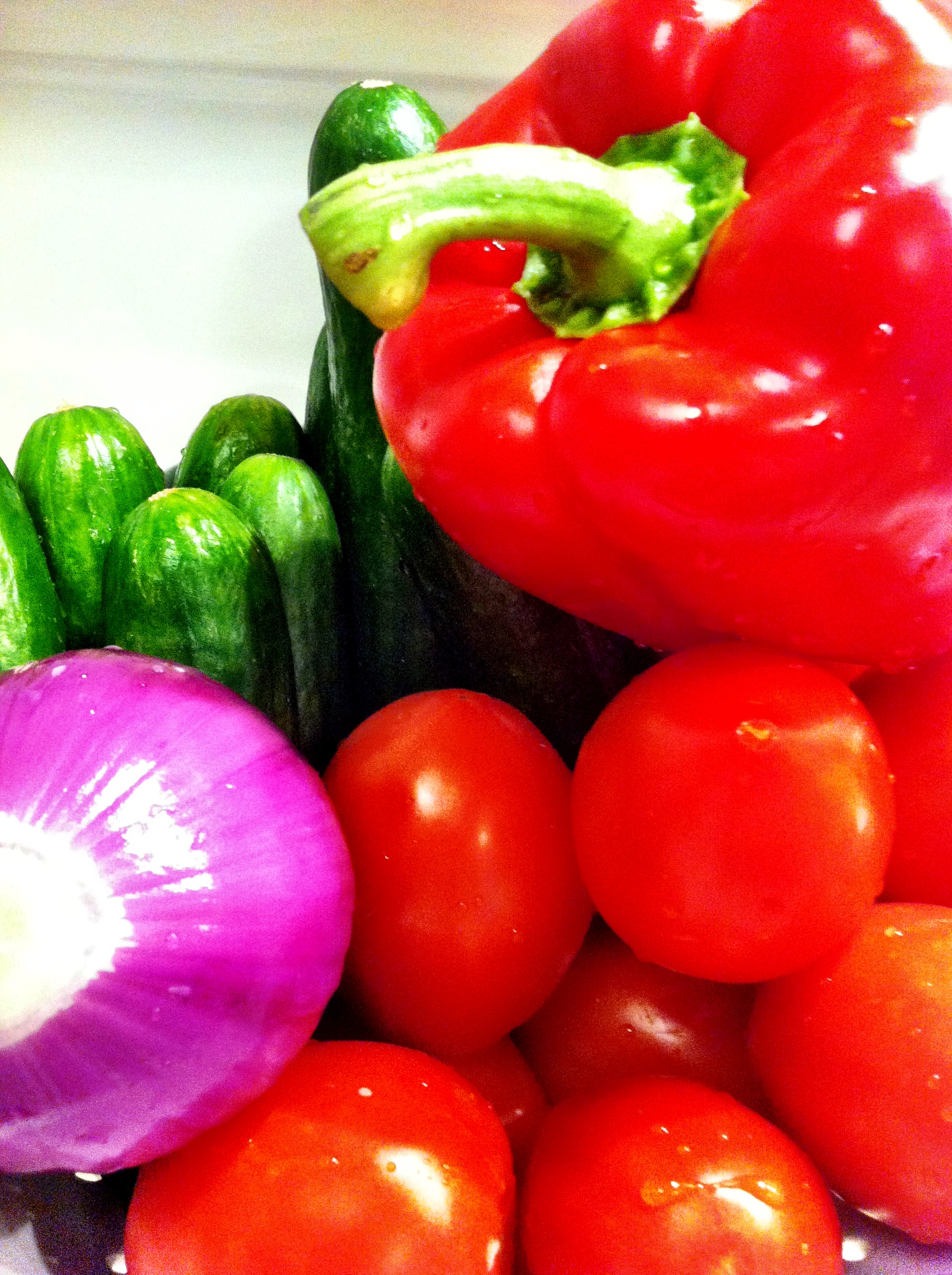 It is a soup originally from Spain prepared nowadays mainly with tomato, cucumber, red pepper and onion. It is basically a blended salad. That makes it even better than many other soups whose ingredients loose many of their nutrients in the cooking process. It’s super quick and easy to prepare if you have a blender and could be made in a big batch and stored in the fridge to be served later in many ways like an appetizer, a main course with a side or simply as a refreshing and super healthy drink.